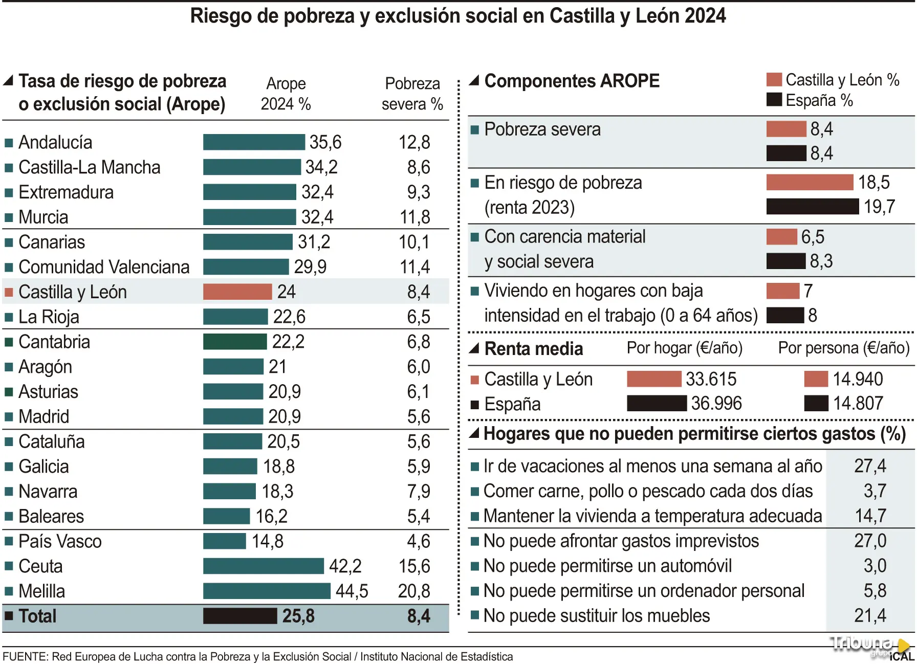 El informe, recogido por la Agencia Ical, revela que el 24% de la población de Castilla y León, que suponen unas 574.000 personas, se encuentra en riesgo de pobreza o exclusión social (tasa Arope) y un 8,4% está en pobreza severa. La situación de pobreza se relaciona con los ingresos económicos, con familias por debajo de los 11.548 euros al año (965 euros al mes), mientras que la severa afecta a las unidades que no llegan a los 644 euros al mes.