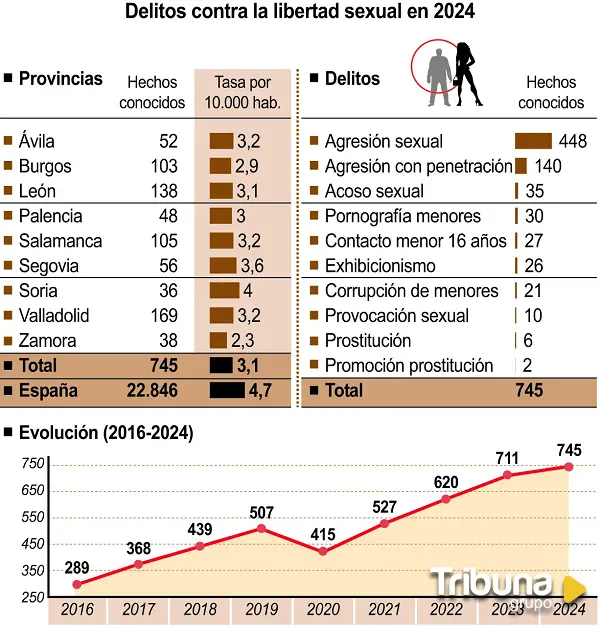 En total, en Castilla y León se registraron el pasado año 745 delitos, de los que el 60,1% fueron agresiones sexuales y el 18,8% violaciones. También se registraron casos de acoso sexual (36 en la Comunidad), pornografía infantil, 'grooming', exhibicionismo, corrupción de menores, provocación sexual y prostitución, aunque las cifras provinciales concretas para estas tipologías no se desglosan.