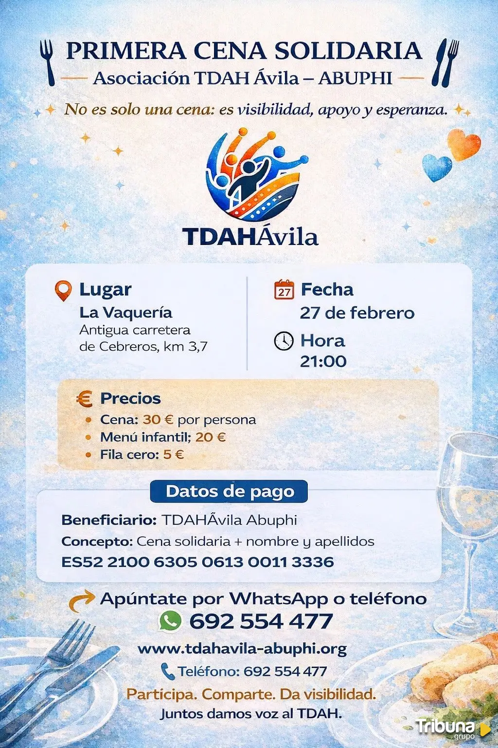 La Asociación TDAH Ávila ABUPHI ha puesto en marcha la I Cena Solidaria, un evento que busca reforzar la concienciación sobre el Trastorno por Déficit de Atención e Hiperactividad (TDAH) y reconocer el respaldo recibido por parte de la sociedad abulense. La iniciativa se celebrará el próximo 27 de febrero a las 21:00 horas en el establecimiento La Vaquería, ubicado en la antigua carretera de Cebreros.